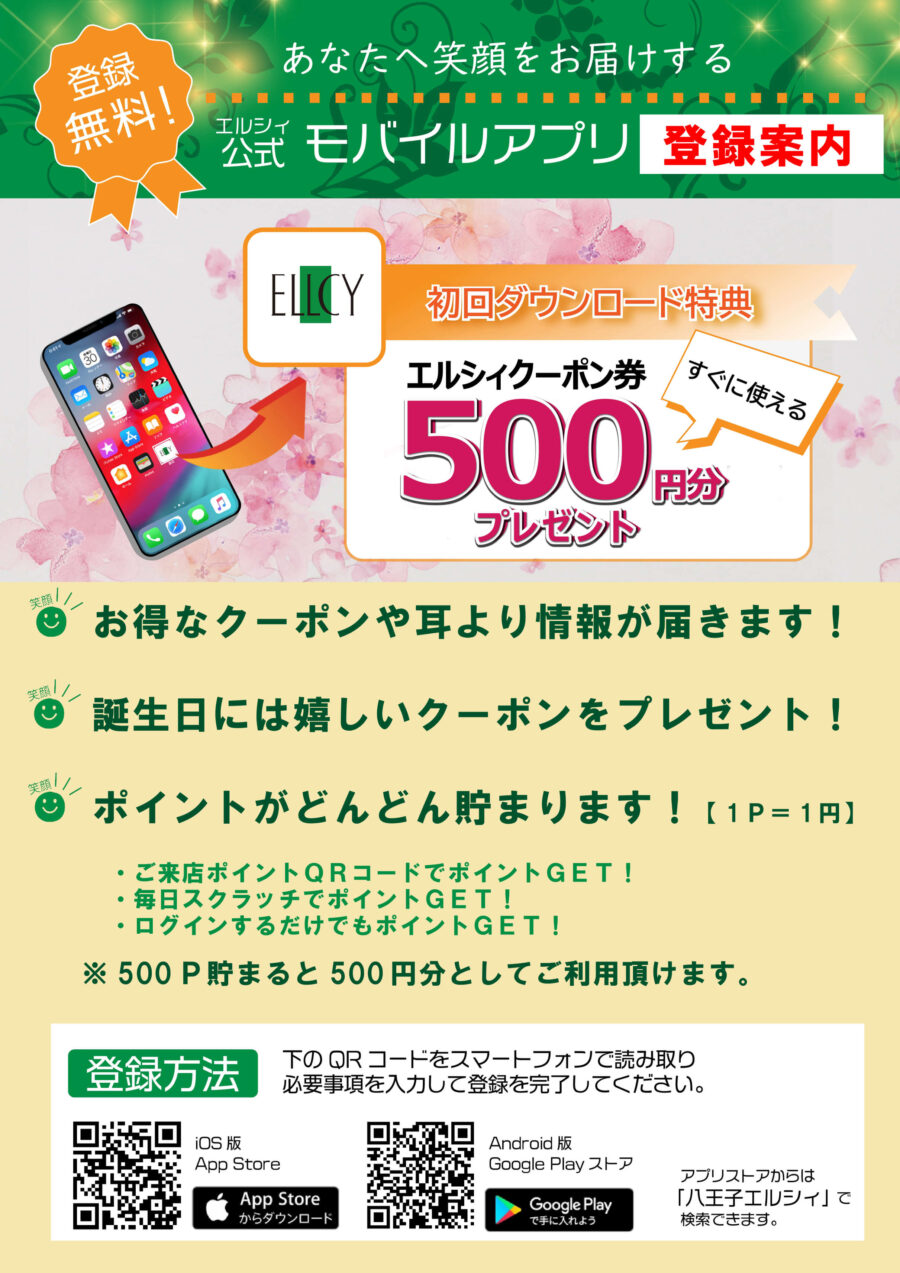 あなたへ笑顔をお届けする 公式モバイルアプリが新登場 初回ダウンロード特典 エルシィクーポン券500円分ゲット! ① お得なクーポンや耳より情報がたくさん届く ② お誕生日には嬉しいクーポンをプレゼント ③ ポイントがどんどん貯まる ④ 保有ポイントが引き継げる