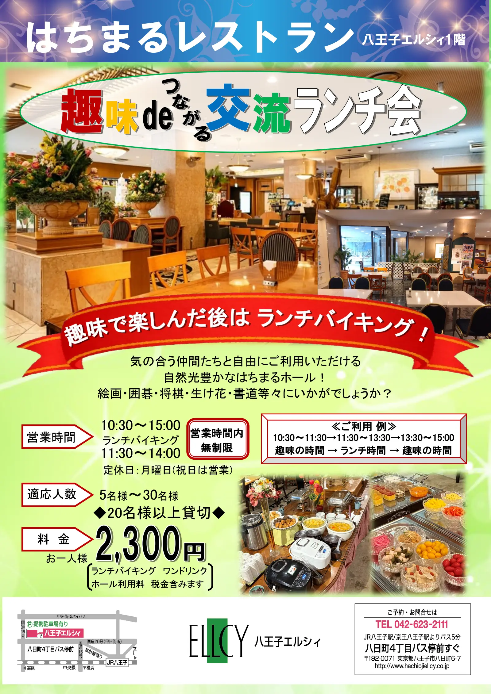 ・会場:1階「はちまるレストラン」 ・ご予約制(ご利用日の3日前まで) ・着席のビュッフェ形式になります ・20名様~承ります ・20名様以下の場合はご相談下さい |