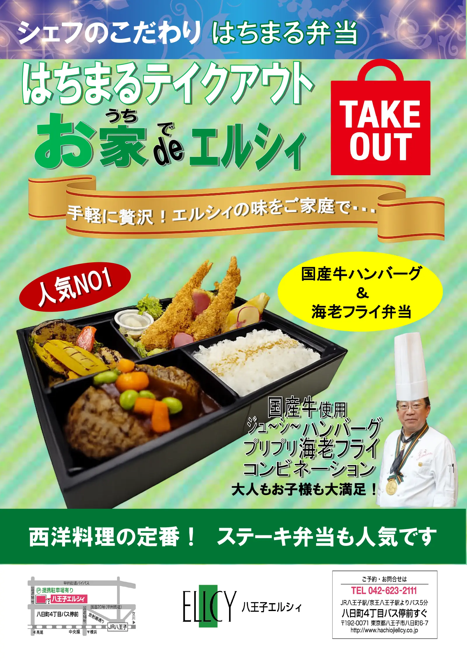 エルシィの味をご自宅で気軽に楽しめる「はちまるテイクアウト」。国産牛を使用したハンバーグとプリプリの海老フライを組み合わせた人気No.1のお弁当をはじめ、ステーキ弁当やランチBOXなど、毎日のランチにも特別なお食事にもおすすめのメニューをご用意しています。ご家庭でのお食事はもちろん、オフィスでのランチにもぜひご利用ください。