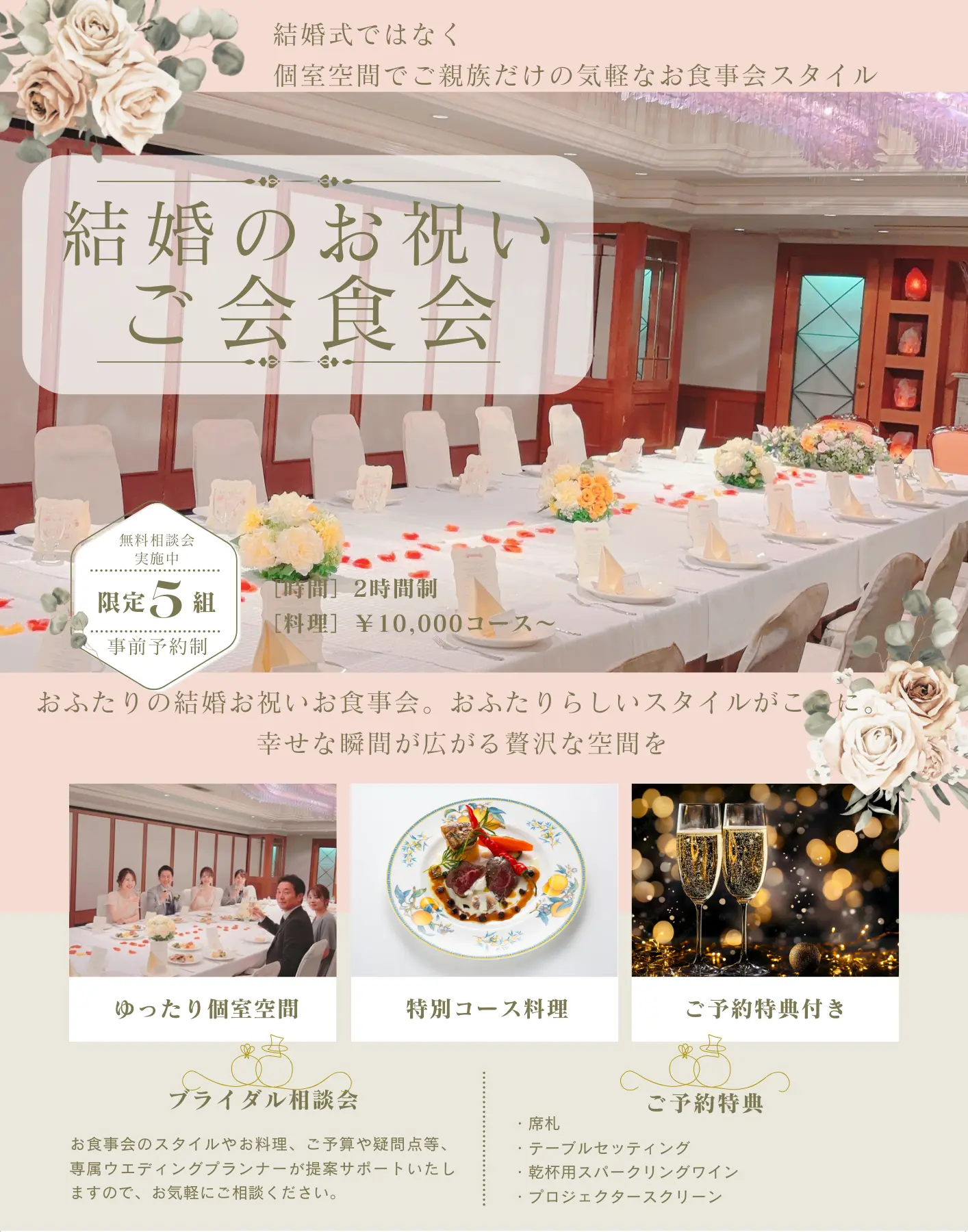 お食事会のスタイルやお料理、ご予算や疑問点など専属ウエディングプランナーが提案・サポートいたします。お気軽にご相談ください。